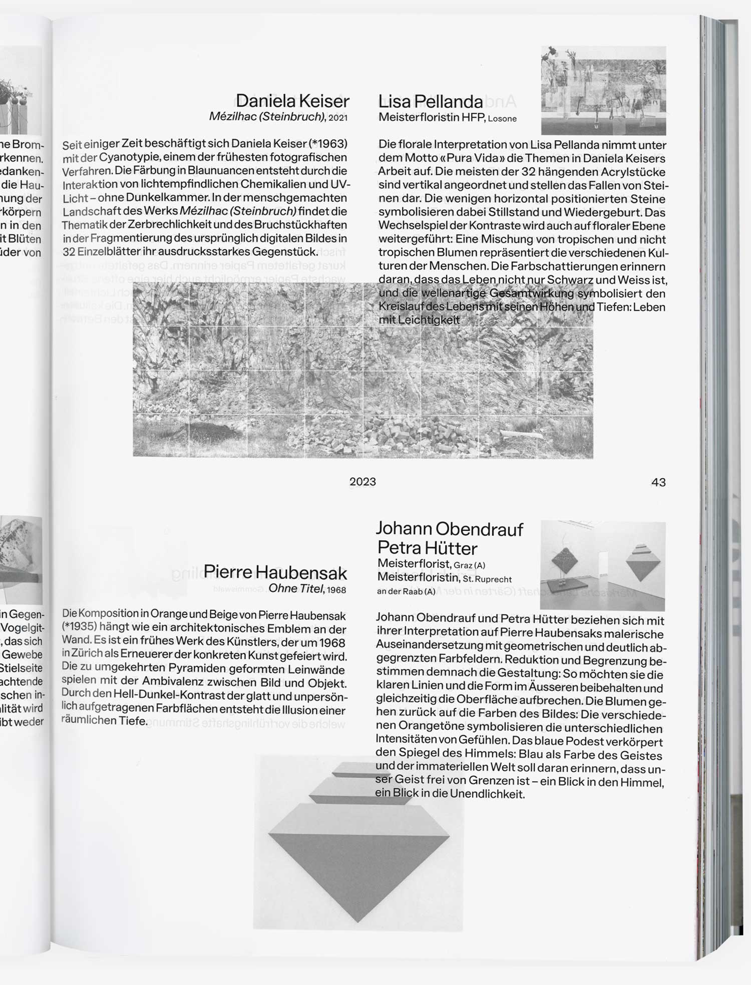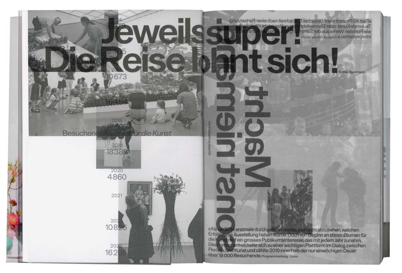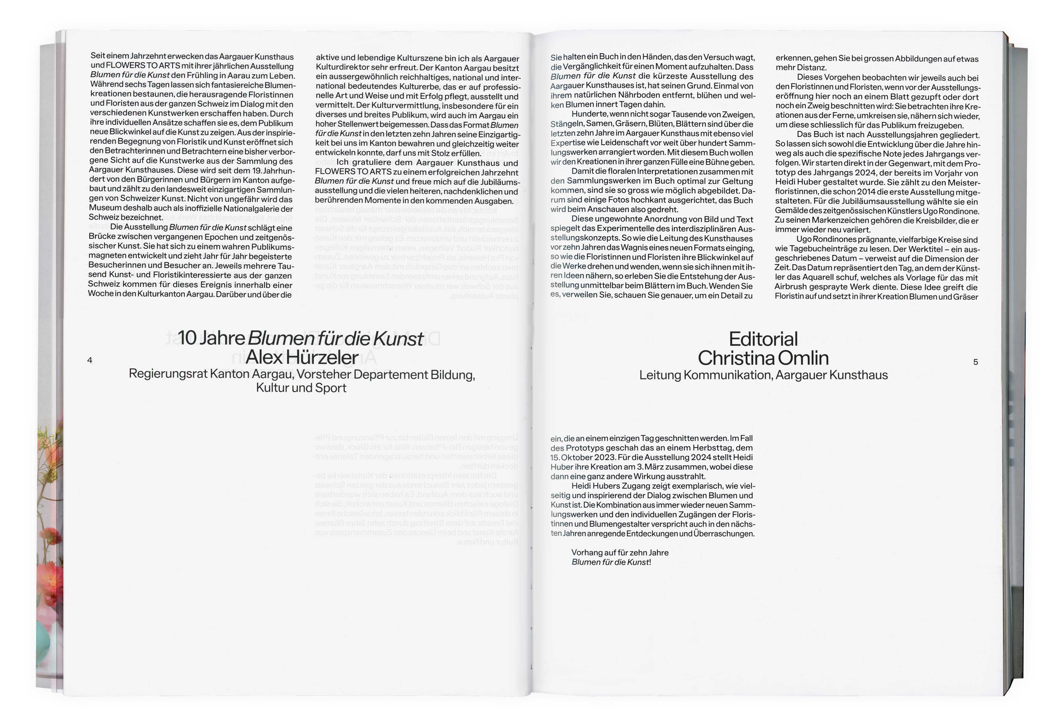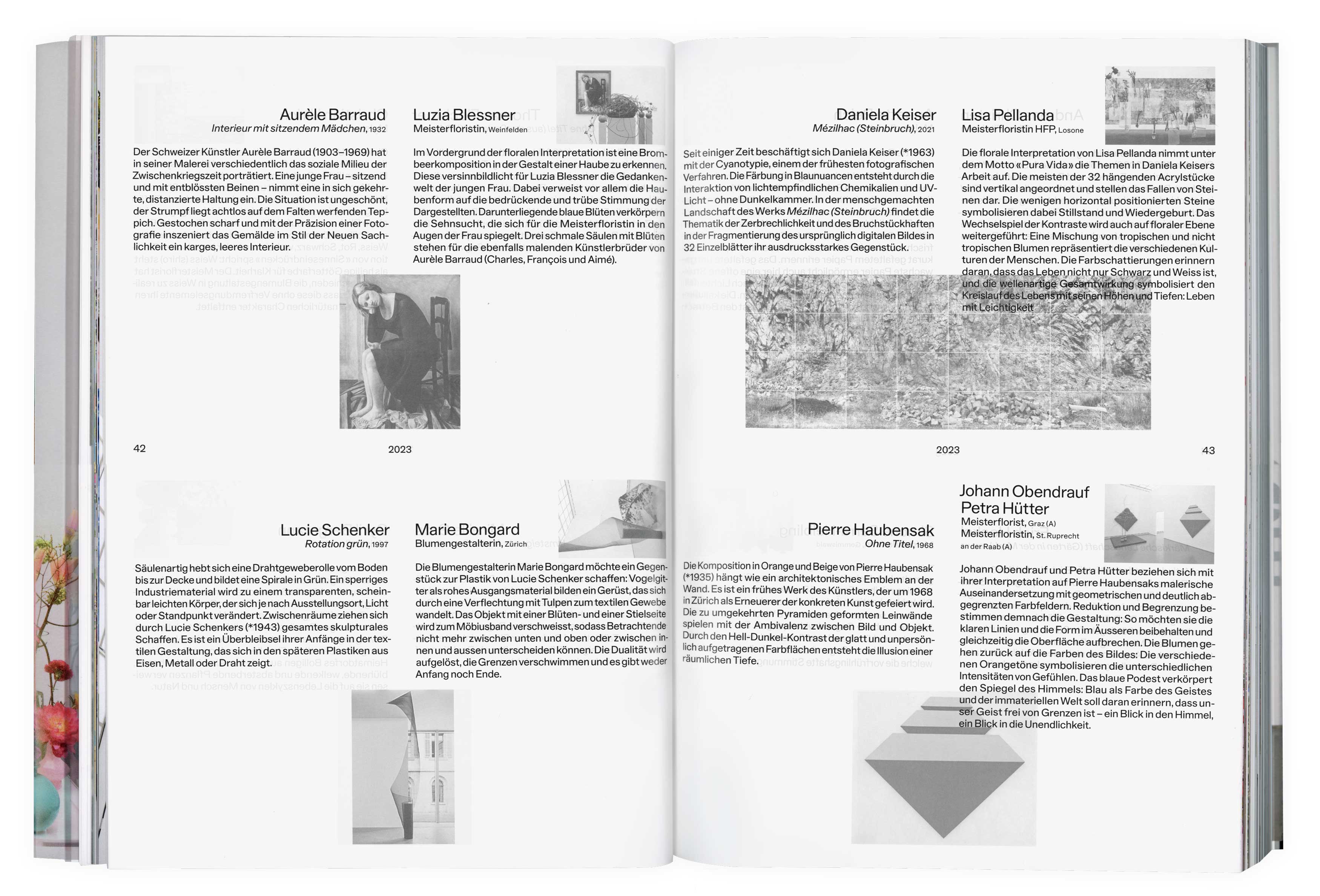The concept of the 10th anniversary publication “Blumen für die Kunst”, dedicated to the eponymous exhibition series, is based on interdisciplinarity and a shift in perspective. The depiction of the floral interpretation relies on a clear, direct typographic language and a bold, image-focused layout. The publication documents the events, capturing their vibrancy and complexity on-site while bringing the various components together in a tactile experience.
