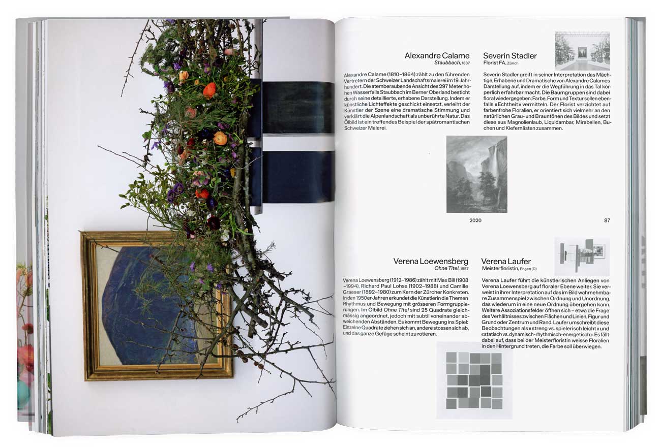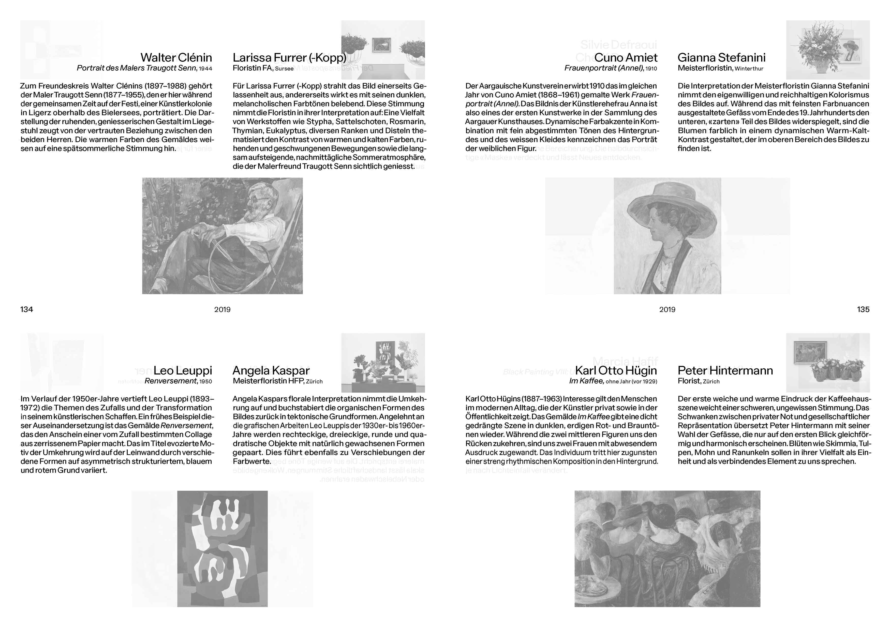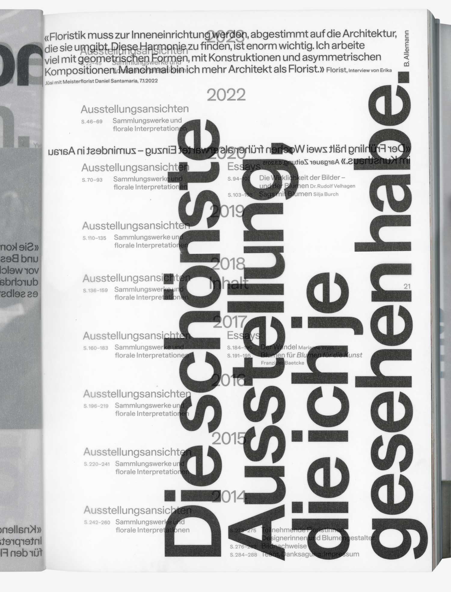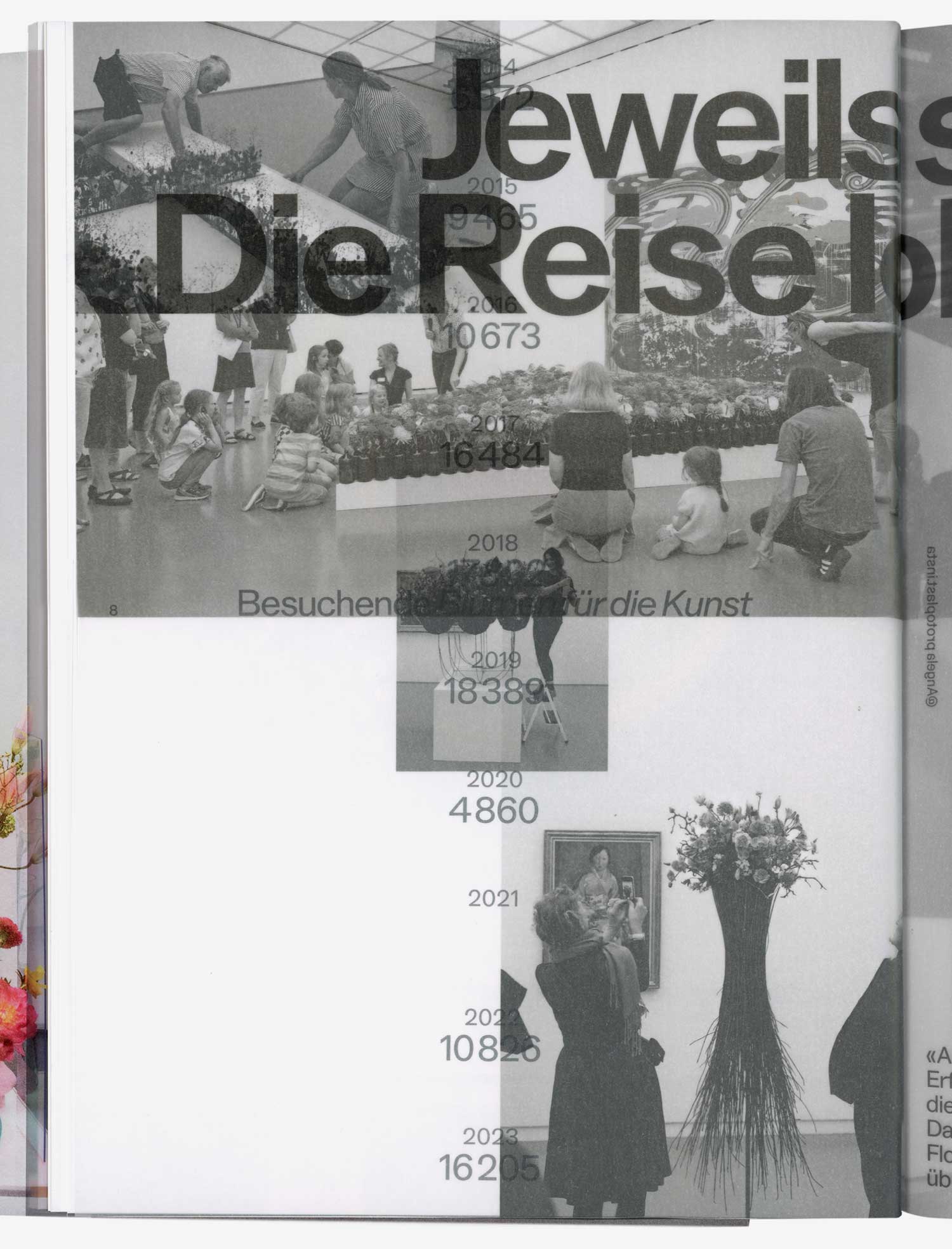 The concept of the 10th anniversary publication “Blumen für die Kunst”, dedicated to the eponymous exhibition series, is based on interdisciplinarity and a shift in perspective. The depiction of the floral interpretation relies on a clear, direct typographic language and a bold, image-focused layout. The publication documents the events, capturing their vibrancy and complexity on-site while bringing the various components together in a tactile experience.