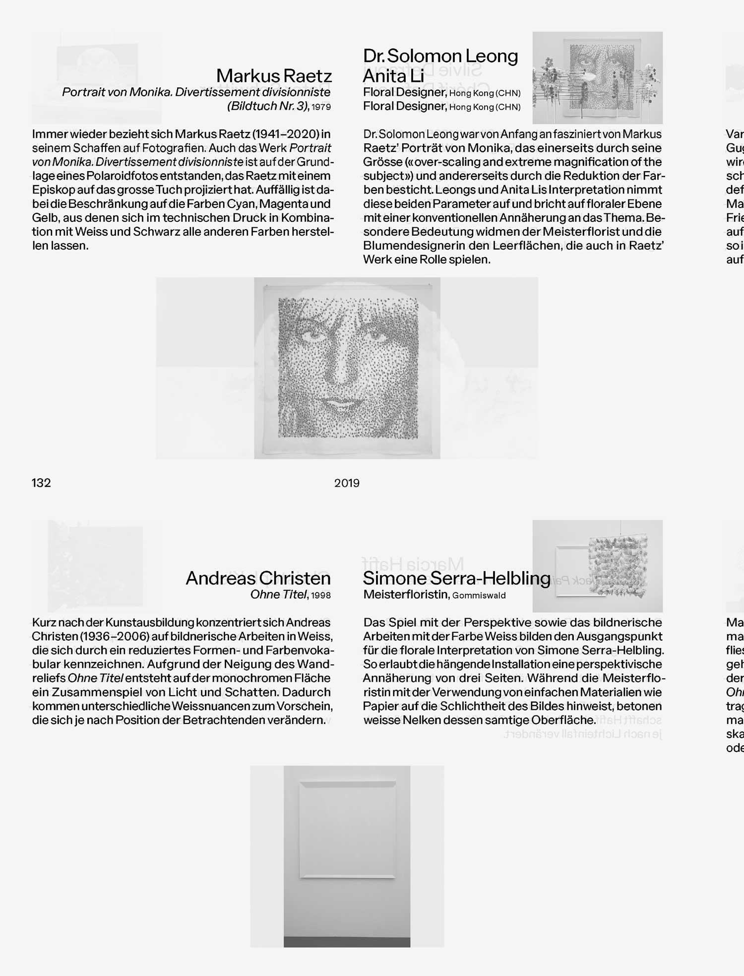 The concept of the 10th anniversary publication “Blumen für die Kunst”, dedicated to the eponymous exhibition series, is based on interdisciplinarity and a shift in perspective. The depiction of the floral interpretation relies on a clear, direct typographic language and a bold, image-focused layout. The publication documents the events, capturing their vibrancy and complexity on-site while bringing the various components together in a tactile experience.